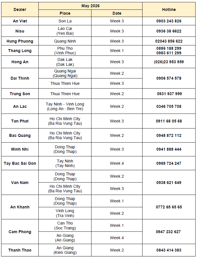 As part of our ongoing efforts to enhance the customer experience, ISUZU Vietnam is pleased to announce the schedule for the “Mobile Service” program in May 2026, bringing authorized services closer to our customers in remote areas. During the program, customers will receive: