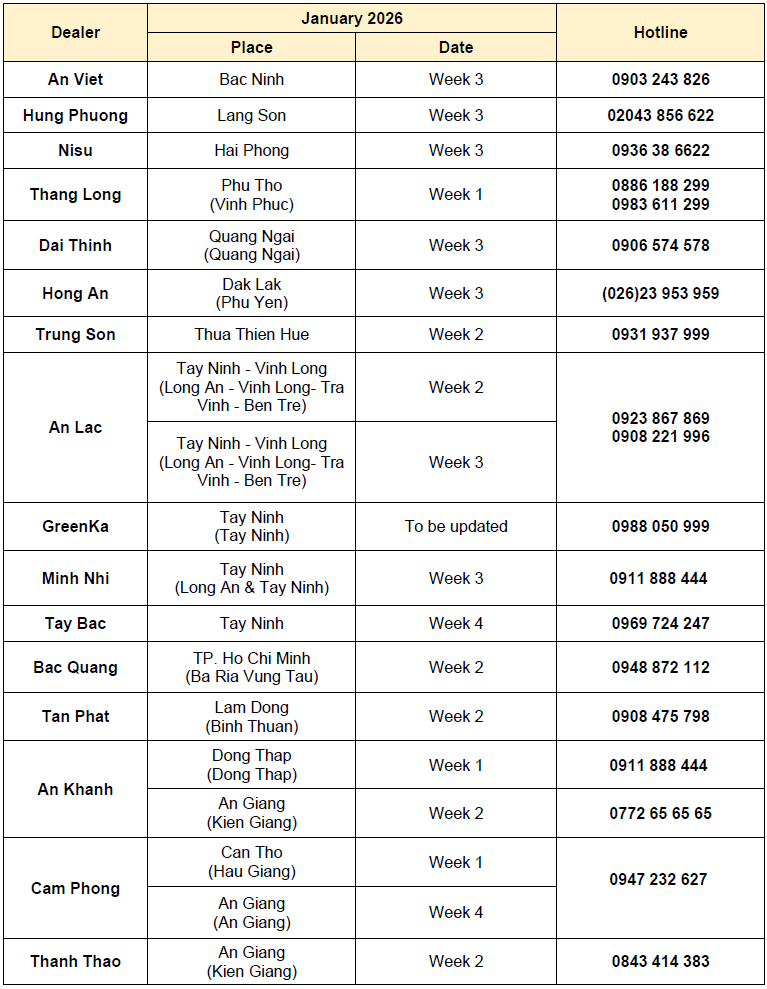 Nhằm tri ân khách hàng đã tin dùng sản phẩm cùng với mong muốn được đồng hành và chăm sóc cho xe được vận hành trong điều kiện hoàn hảo nhất. ISUZU Việt Nam xin gửi đến Quý Khách hàng lịch trình tổ chức chương trình “Bảo dưỡng & Sửa chữa lưu động” trong tháng 1 năm 2026.
