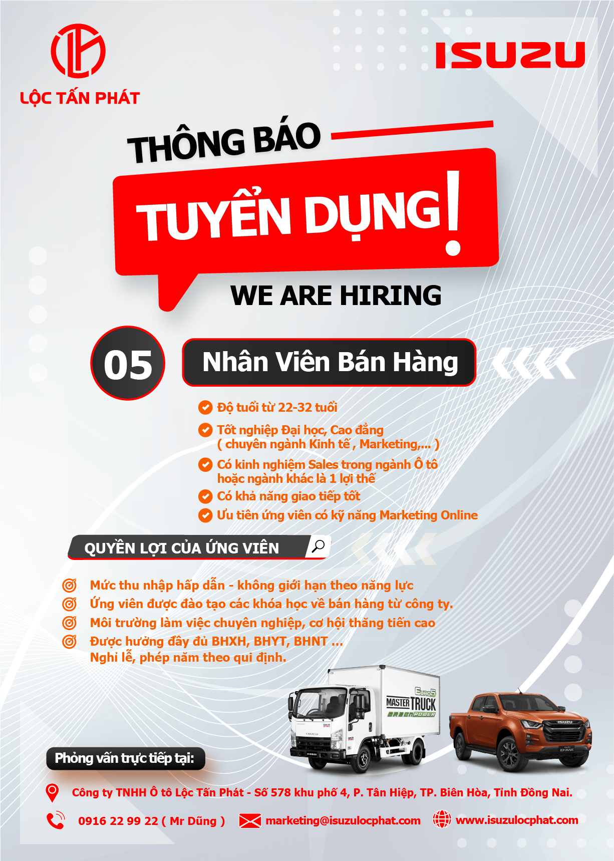 ISUZU LỘC PHÁT luôn tìm kiếm các cơ hội mới để phát triển sự nghiệp của mình. Hiện tại, chúng tôi đang mở cửa cho 05 vị trí Nhân Viên Bán Hàng trong đội ngũ của chúng tôi.